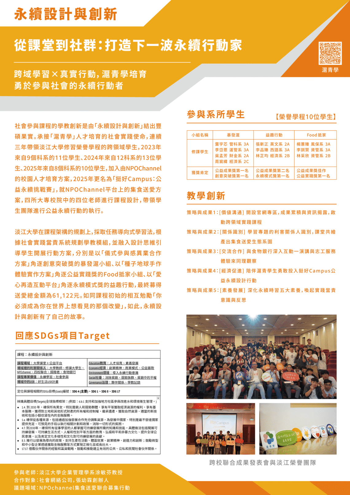 活動名稱:2025課程合展|淡味創生見里山日期時間:2025年06月授課教師:淡江大學企業管理學系涂敏芬教授課程名稱:永續設計與創新合作/議題場域:合作對象|社會網絡公司,張幼霖創辦人、議題場域|NPOchannel集食送愛聯合募集行動SDG Targets:4.7、1.4、1.a、8.3、17.17 跨域學習×真實行動,滬青學培育勇於參與社會的永續行動者 社會參與課程的學教創新是由「永續設計與創新」結出豐碩果實。承接「滬青學」人才培育的社會實踐使命,連續三年帶領淡江大學修習榮譽學程的跨領域學生...