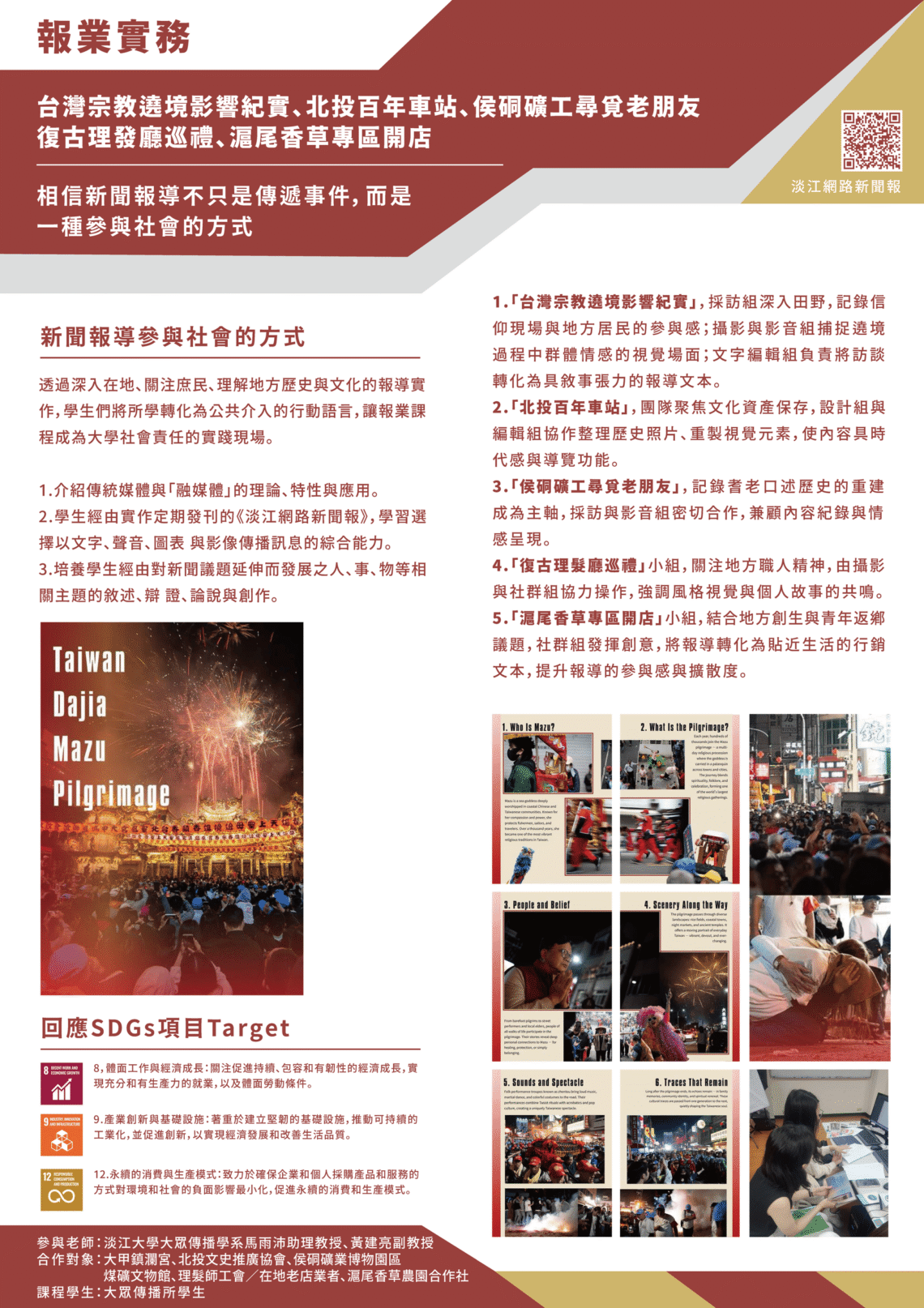 活動名稱:2025課程合展|淡味創生見里山日期時間:2025年06月授課教師:淡江大學大傳系馬雨沛助理教授、大傳系黃建亮教師課程名稱: 淡江大學報業實務合作/議題場域:大甲鎮瀾宮、北投文史推廣協會、侯硐礦業博物園區/煤礦文物館、理髮師工會/在地老店業者、滬尾香草農園合作社SDG Targets:8、9、12 我們相信新聞報導不只是傳遞事件,而是一種參與社會的方式。透過深入在地、關注庶民、理解地方歷史與文化的報導實作,學生們將所學轉化為公共介入的行動語言,讓報業課程成為大學社會責任的實踐現場 新聞...