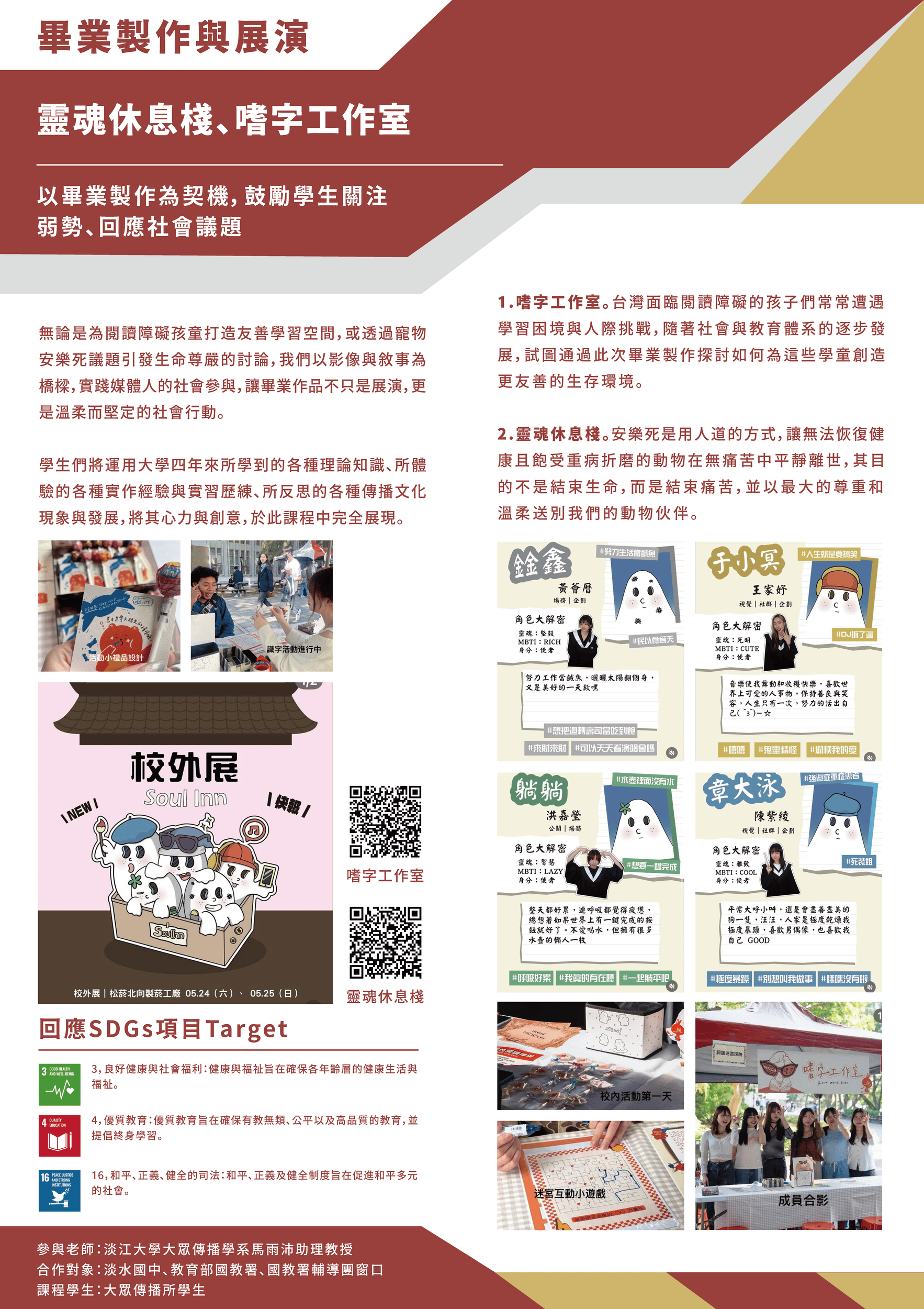 本課程以畢業製作為契機,鼓勵學生關注弱勢、回應社會議題。無論是為閱讀障礙孩童打造友善學習空間,或透過寵物安樂死議題引發生命尊嚴的討論,我們以影像與敘事為橋樑,實踐媒體人的社會參與,讓畢業作品不只是展演,更是溫柔而堅定的社會行動
