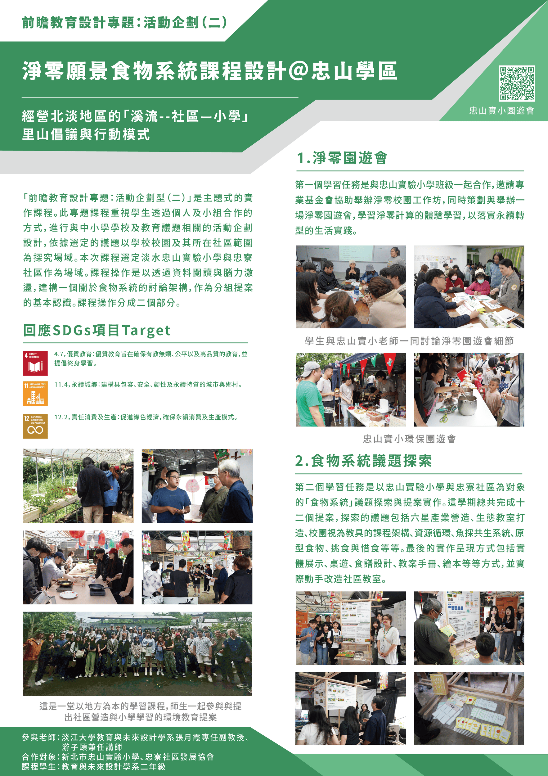 「前瞻教育設計專題:活動企劃型(二)」是主題式的實作課程。此專題課程重視學生透過個人及小組合作的方式,進行與中小學學校及教育議題相關的活動企劃設計,依據選定的議題以學校校園及其所在社區範圍為探究場域。本次課程選定淡水忠山實驗小學與忠寮社區作為場域。