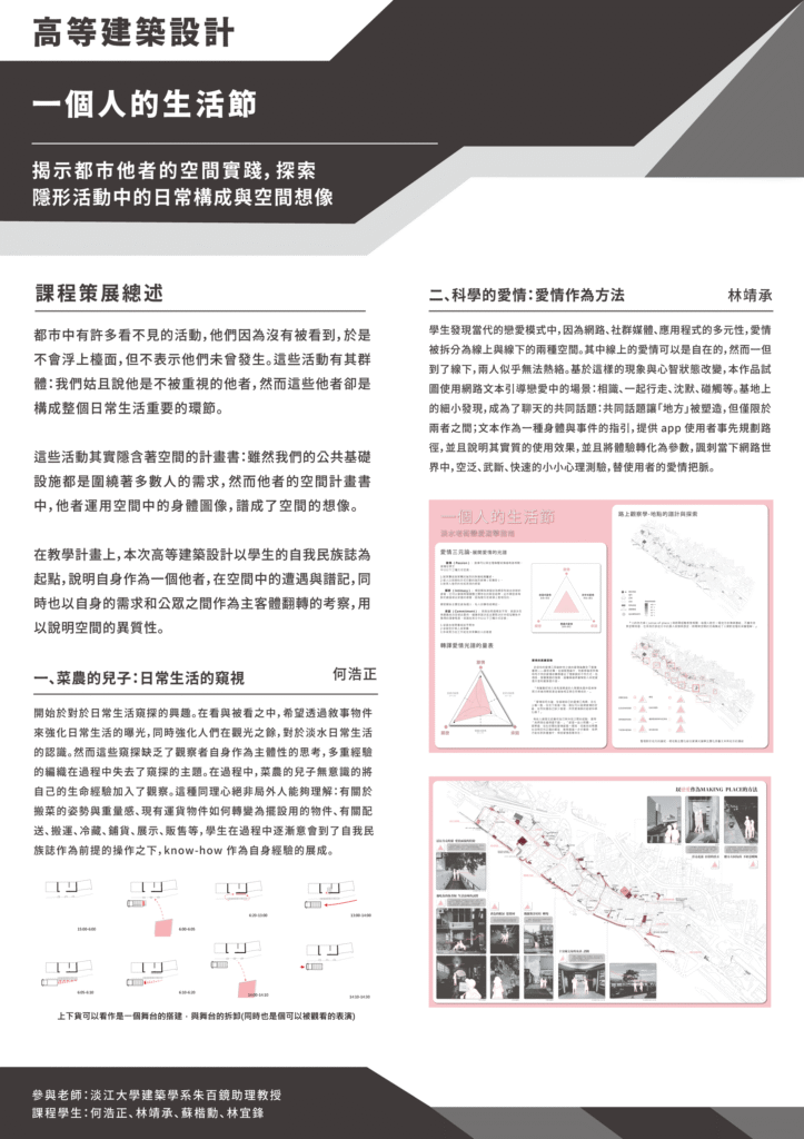 在教學計畫上,本次高等建築設計以學生的自我民族誌為起點,說明自身作為一個他者,在空間中的遭遇與譜記,同時也以自身的需求和公眾之間作為主客體翻轉的考察,用以說明空間的異質性。