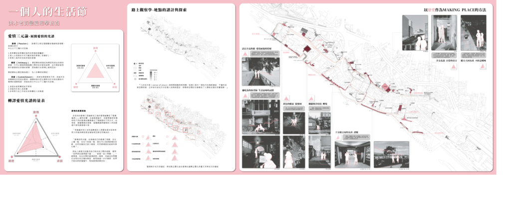 學生發現當代的戀愛模式中,因為網路、社群媒體、應用程式的多元性,愛情被拆分為線上與線下的兩種空間。其中線上的愛情可以是自在的,然而一但到了線下,兩人似乎無法熱絡。基於這樣的現象與心智狀態改變,本作品試圖使用網路文本引導戀愛中的場景:相識、一起行走、沈默、碰觸等。基地上的細小發現,成為了聊天的共同話題:共同話題讓「地方」被塑造,但僅限於兩者之間;文本作為一種身體與事件的指引,提供 app 使用者事先規劃路徑,並且說明其實質的使用效果,並且將體驗轉化為參數,諷刺當下網路世界中,空泛、武斷、快速的小小心理測驗,替使用者的愛情把脈。
