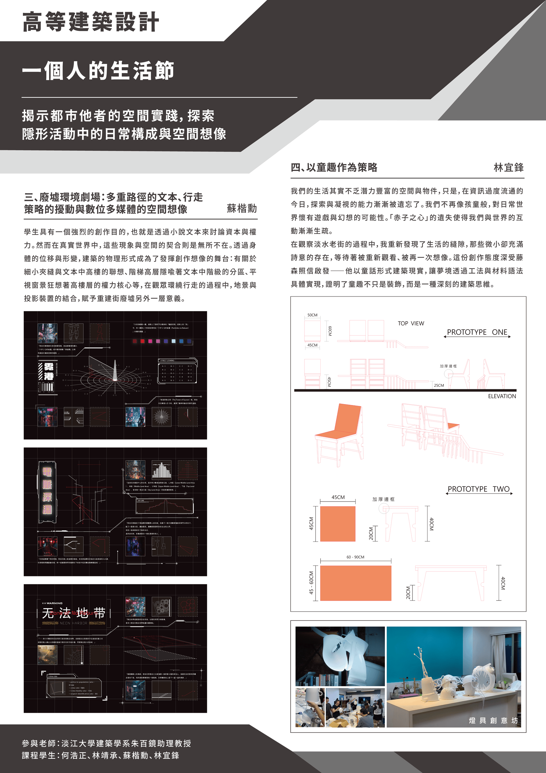 在教學計畫上,本次高等建築設計以學生的自我民族誌為起點,說明自身作為一個他者,在空間中的遭遇與譜記,同時也以自身的需求和公眾之間作為主客體翻轉的考察,用以說明空間的異質性。